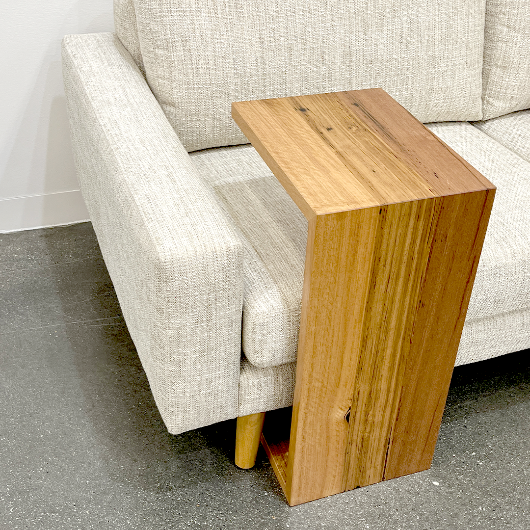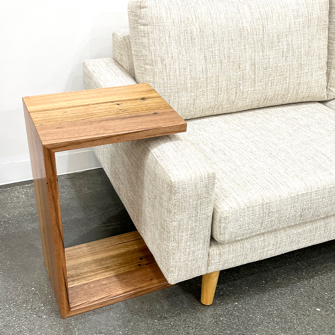 The square profile and cantilevered design allow it to slide neatly over sofas, armchairs, or beds, providing a convenient surface for your coffee, books, or laptop.