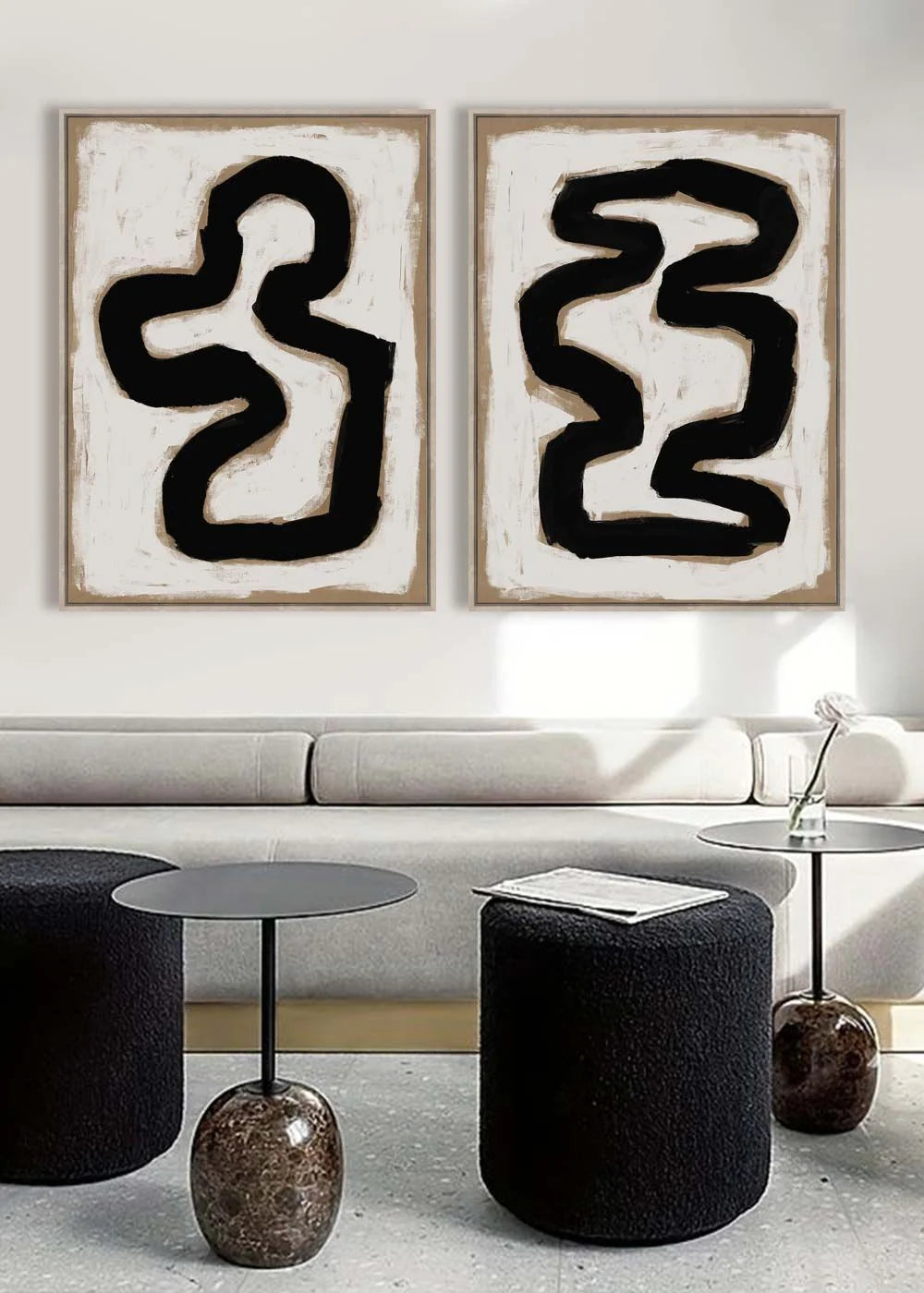Set of two textured hand painted artworks on canvas. Finished in a light Oak coloured floater frame.