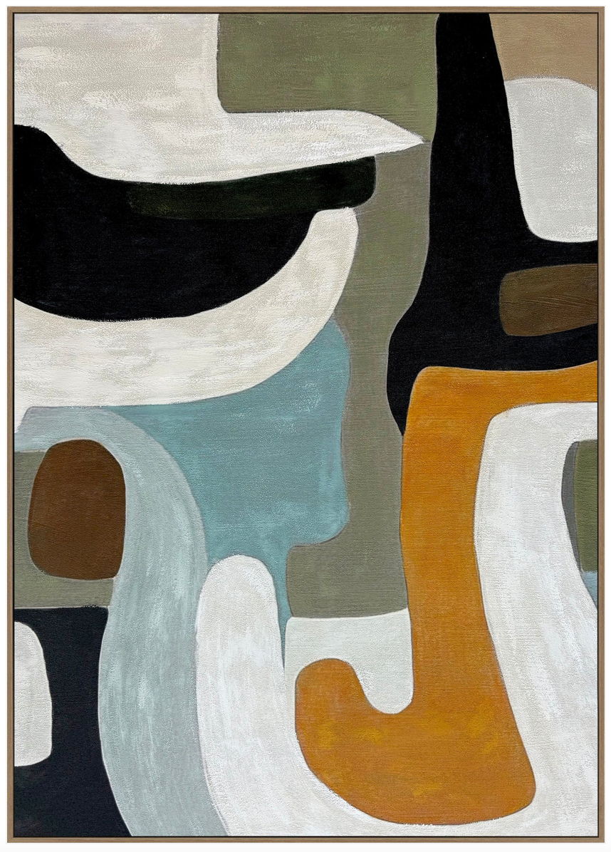 Description: Gateway brings a bold abstract composition to the home, featuring layered organic shapes in earthy greens, creams, blacks, and warm ochre. The interplay of curved and structured forms creates a sense of movement and balance, making it a striking focal point for modern interiors. Hand-painted on canvas and finished in an oak frame for a natural, refined edge.
