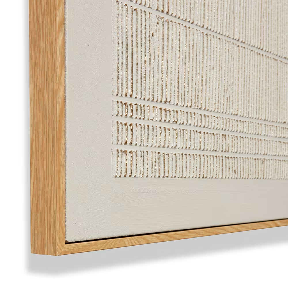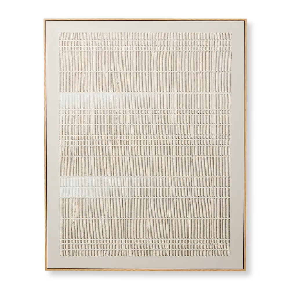 The Ruguru artwork features a beige and white neutral linear design rendered in muted neutral tones, creating a calm and balanced visual rhythm. Framed minimally, it offers a serene contemporary presence that enriches any room.