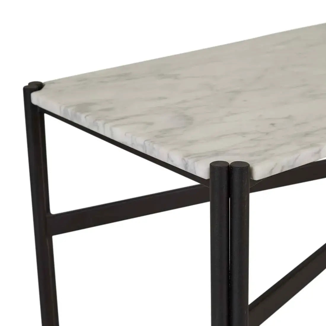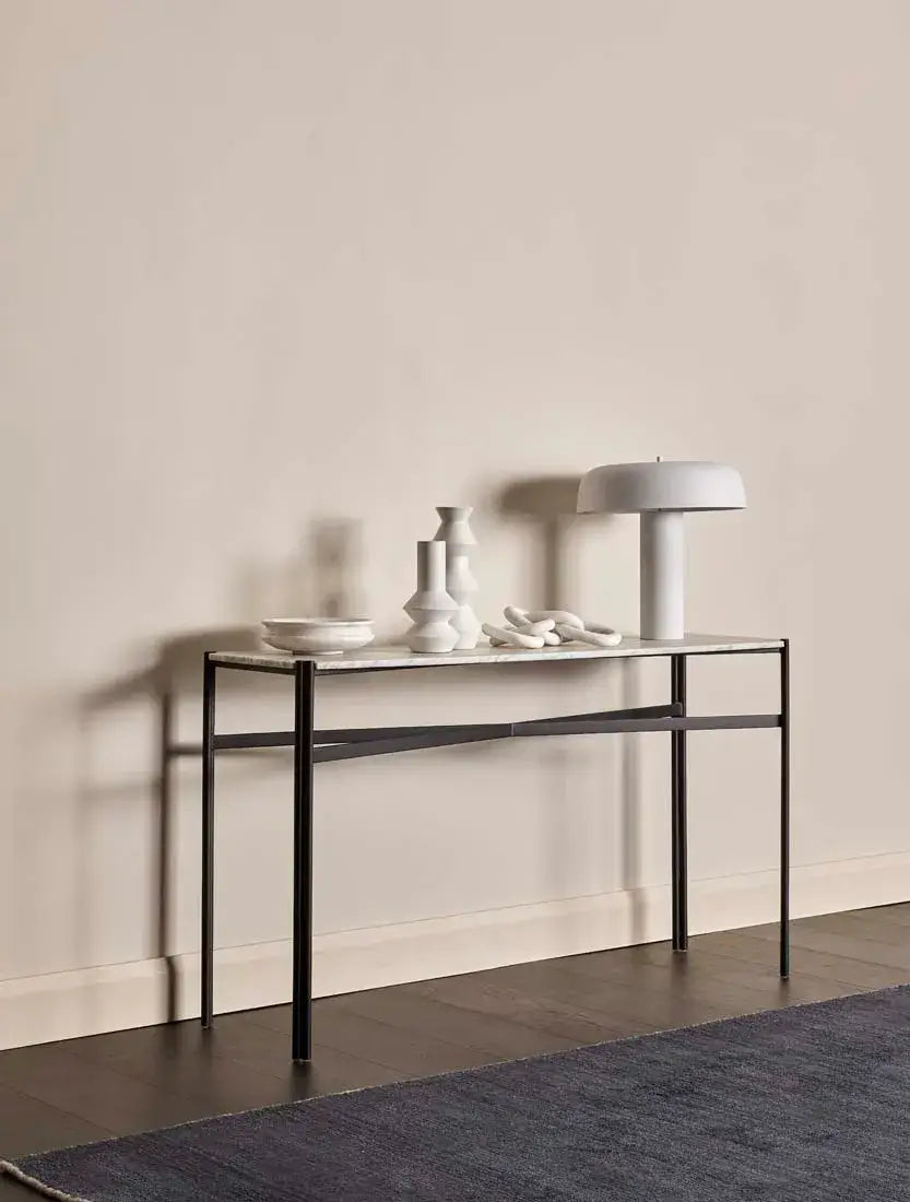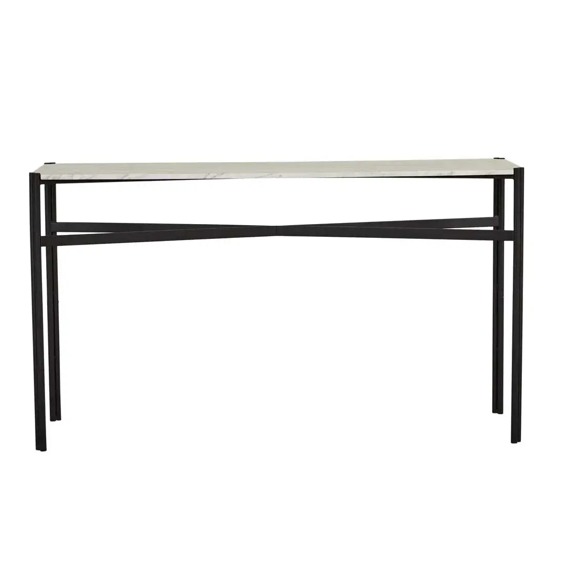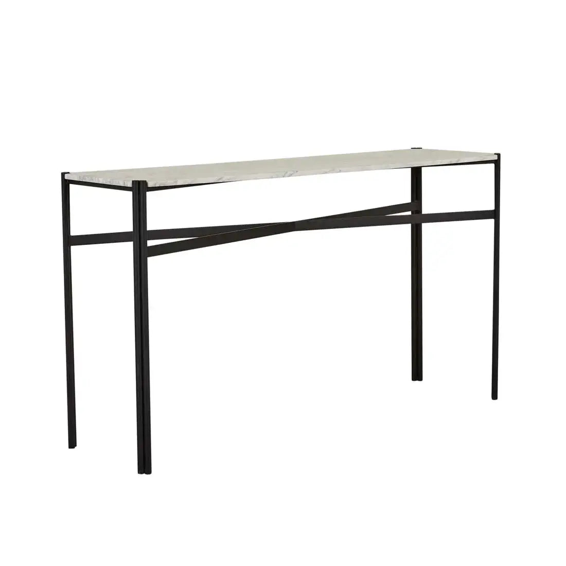 This eye-catching console table is ideal for making a classic statement in an entryway or foyer. The Atlas Twin Console Table has a smooth matt marble top and slender legs with a black metal decorative crossbar and dual-pipe frame for a touch of industrial flair.