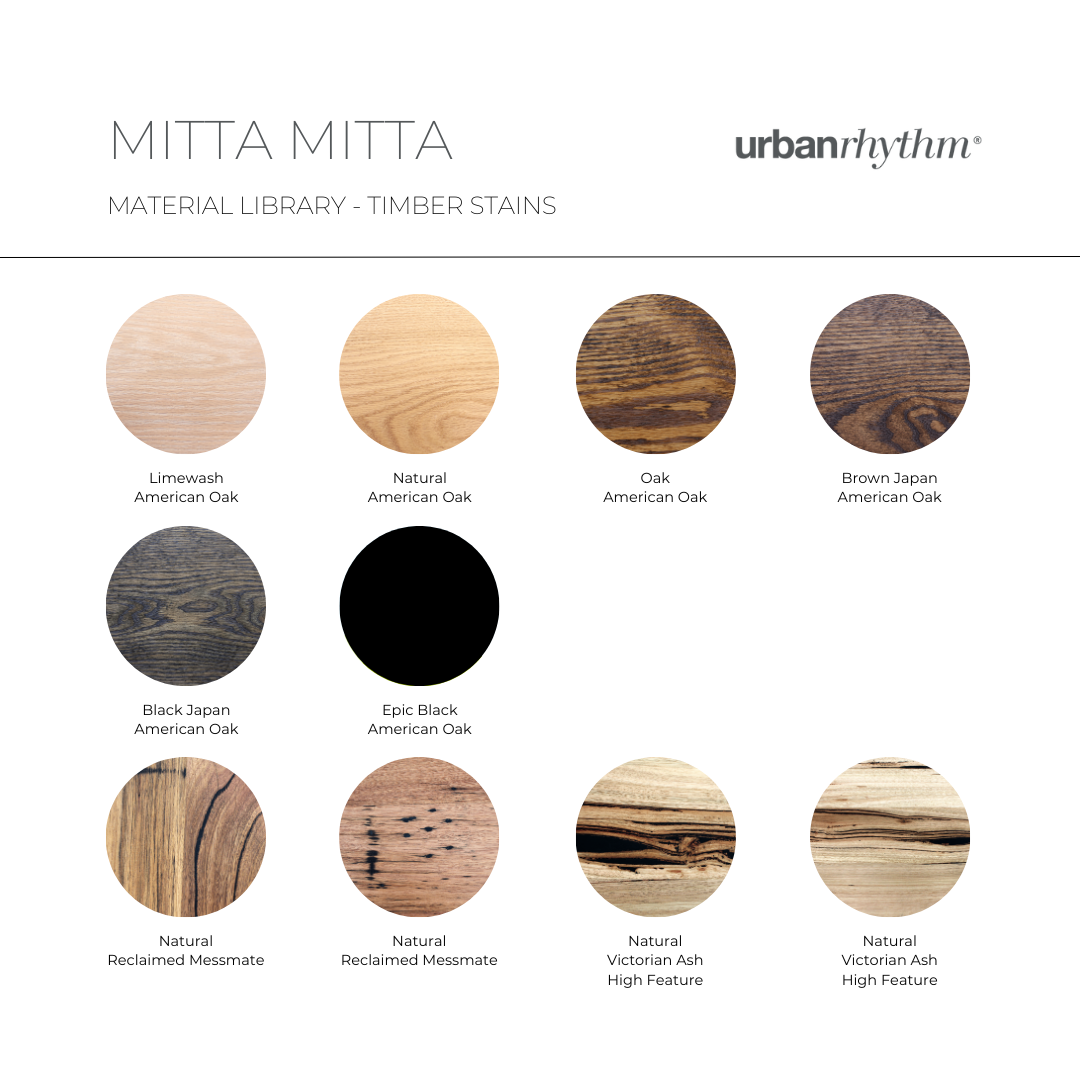 Available in American Oak, high feature Victorian Ash or medium feature Reclaimed Australian Messmate. Other stain colours available.
