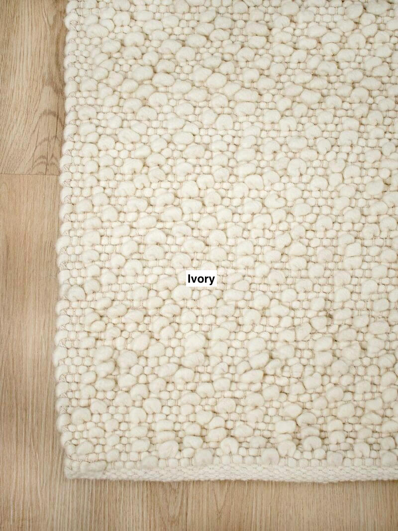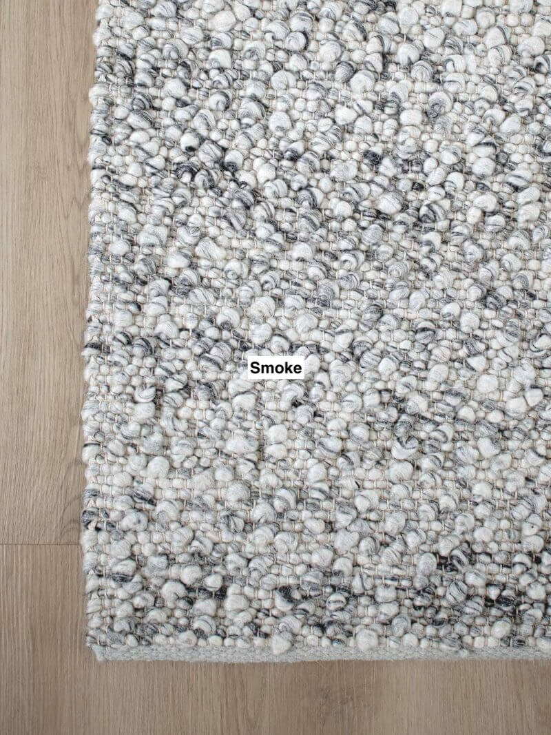 A plush and soft loop-pile weave, this contemporary textured handwoven rug is 100% pure wool. Available in Frost, Ivory, Smoke